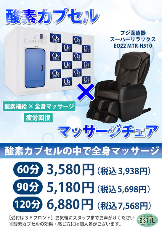 酸素ボックスの中で全身マッサージ、疲労回復も
