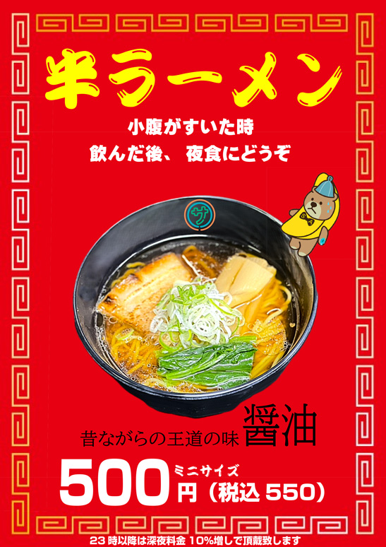 ミニサイズ 半ラーメン がワンコイン 500円!!(税別)