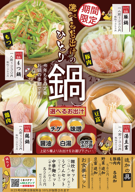 ・湯豆腐 ・鶏鍋 ・豚鍋 ・もつ鍋